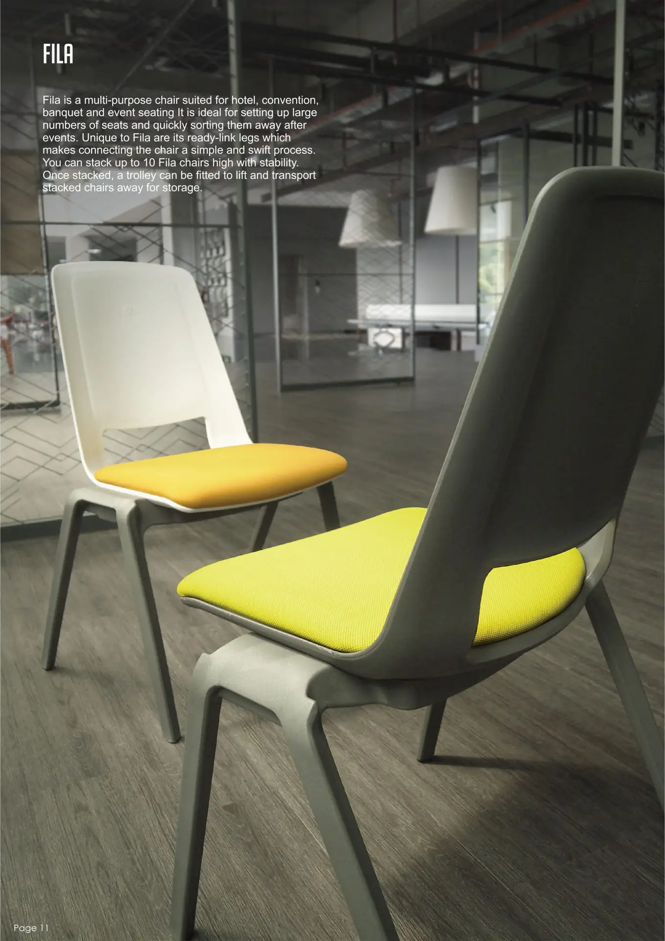 Fila is a multipurpose chair suited for hotel, convention, banquet, office and event seating. It is ideal for setting up large numbers of seats and quickly sorting them away after events. Unique to Fila are its ready-link legs which makes connecting the chair a simple and swift process. You can stack up to 10 Fila chairs high with stability. Once stacked, a trolley can be fitted to lift and transport stacked chairs away for storage.